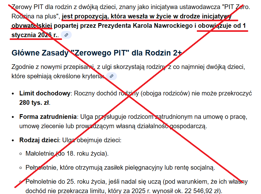 Do redakcji PIT.pl zgłosił się czytelnik z zapytaniem, czy będzie mógł skorzystać z zerowego PIT dla rodzin z co najmniej dwójką dzieci w rozliczeniach PIT w 2026 roku. Czytelnik ten był przekonany, że przepisy weszły w życie, gdyż taką wiadomość wyczytał w automatycznie wygenerowanej odpowiedzi AI, która wyświetla się w wyszukiwarce.