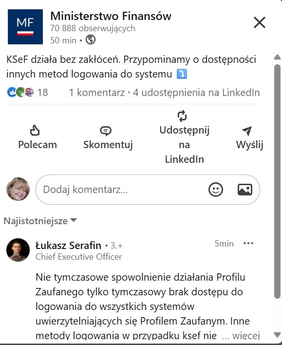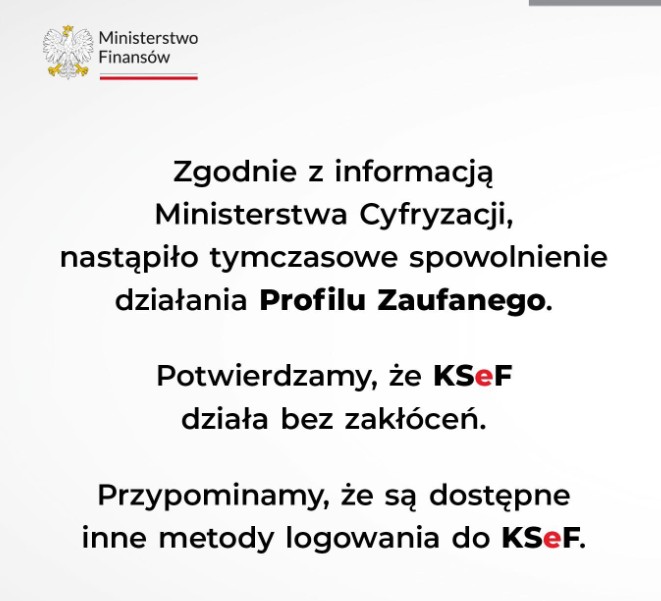 Choć nasuwa się jedno – to nie było „tymczasowe spowolnienie”, tylko zupełny brak dostępności logowania się za pośrednictwem Profilu Zaufanego, który trwał od ok. godz. 10.30. Dodatkowo wiele osób celnie zauważa, że: „Inne metody logowania w przypadku ksef nie są powszechnie i darmowo dostępne.”