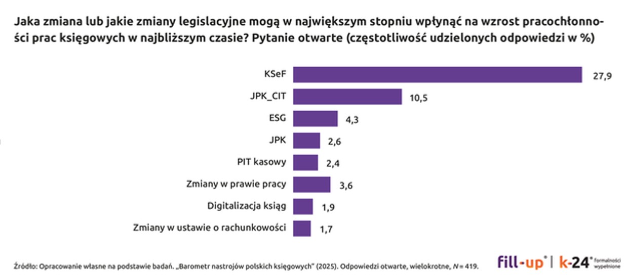 Ze spontanicznych odpowiedzi otwartych wynika, że księgowi obawiają się dodatkowych obowiązków sprawozdawczych, takich jak JPK_CIT oraz raportowanie ESG. Nieco dalej na liście najbardziej pracochłonnych zmian znajdują się: JPK, PIT kasowy, zmiany w prawie pracy, digitalizacja ksiąg, zmiany w ustawie o rachunkowości. Najczęściej jednak badani wskazywali na KSeF.