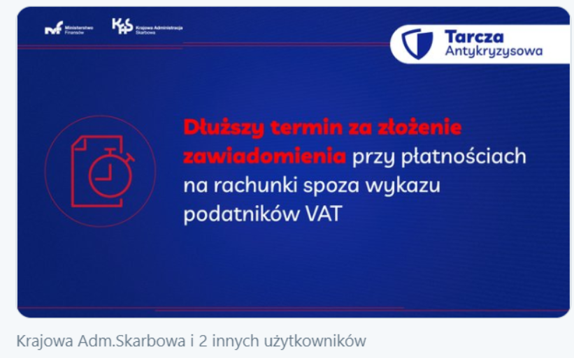 Ministerstwo Finansów poinformowało o wydłużeniu terminu na złożenie zawiadomienia o dokonaniu płatności na rachunek spoza wykazu podatników VAT. Aktualnie obowiązujący czas na złożenie zawiadomienia wynosi 3 dni. Termin ten zostanie wydłużony do 14 dni.