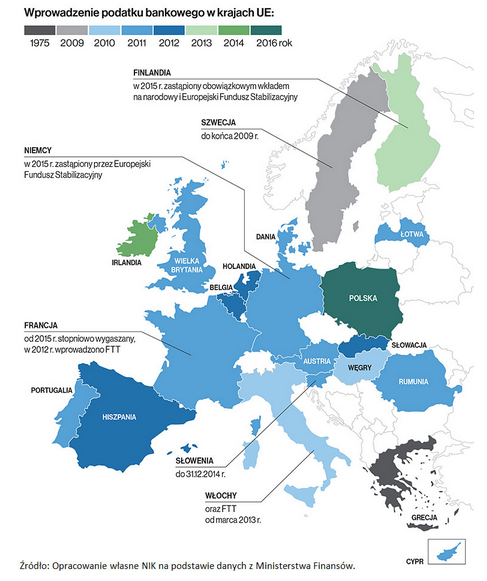 Podatek bankowy obowiązuje w większości europejskich państw – wprowadziło go 21 z 28 państw UE. Konstrukcja podatku od sektora finansowego w poszczególnych państwach UE jest dostosowana do specyfiki lokalnego rynku finansowego. Opodatkowanie aktywów, analogicznie jak w Polsce, wprowadzono w 5 innych państwach: Finlandii, Francji, Grecji, Słowenii i na Węgrzech, jednakże w tych państwach przyjęto odmienną stawkę podatku oraz inny sposób ustalania podstawy opodatkowania. W 12 państwach podstawą opodatkowania są pasywa, w 3 państwach opodatkowanie odbywa się w inny sposób.
