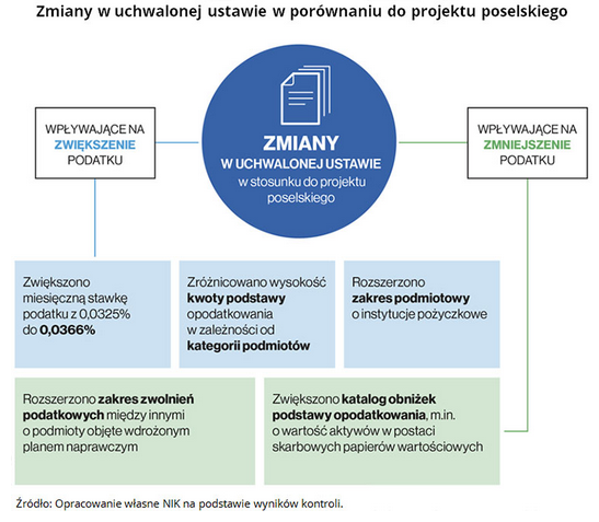 Zmiany wprowadzone w toku prac legislacyjnych polegały m.in. na tym, że zwiększono katalog obniżek podstawy opodatkowania o wartość aktywów w postaci skarbowych papierów wartościowych oraz rozszerzono zakres zwolnień podatkowych o podmioty objęte wdrożonym planem naprawczym. Pozostałe zmiany (rozszerzenie zakresu podmiotowego o instytucje pożyczkowe, zwiększenie miesięcznej stawki podatku z 0,0325 proc. do 0,0366 proc.) wpływały na zwiększenie dochodów z podatku.