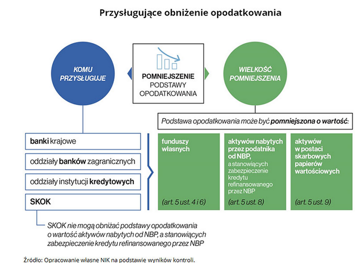 Podstawą opodatkowania dla banków jest nadwyżka sumy wartości aktywów ponad kwotę 4 mld złotych, dla ubezpieczycieli jest to 2 mld zł, a dla firm pożyczkowych kwotą wolną od tego podatku będą aktywa o wartości ponad 200 mln zł. Podstawę pomniejsza się o fundusze własne banków, obligacje skarbowe znajdujące się w portfelu banków, aktywa nabyte od NBP stanowiące zabezpieczenie kredytu refinansowego udzielonego przez NBP oraz środki banków spółdzielczych utrzymywane na rachunkach w bankach zrzeszających. Średniomiesięczna wartość aktywów w analizowanym przez NIK okresie wzrosła z 1426,4 mld zł w 2016 r. do 1455,7 mld zł w 2017 r. (tj. o 2,1 proc.). Średniomiesięczna wartość podstawy opodatkowania wzrosła z 971,1 mld zł za 11 miesięcy 2016 r. do 979,5 mld zł za osiem miesięcy 2017 r. (tj. o 0,9 proc.).