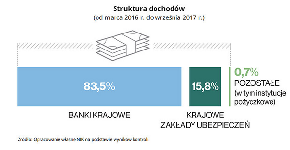 Dominujący udział w zrealizowanych dochodach z podatku miały banki krajowe (83,5 proc.) oraz krajowe zakłady ubezpieczeń (15,8 proc.). Pozostałe podmioty zrealizowały łącznie 0,7 proc. wpływów (w tym instytucje pożyczkowe 0,6 proc.). W okresie od marca 2016 r. do września 2017 r. co najmniej raz deklaracje FIN-1 złożyło 90 instytucji finansowych (miesięcznie od 75 do 82 w kontrolowanym okresie).