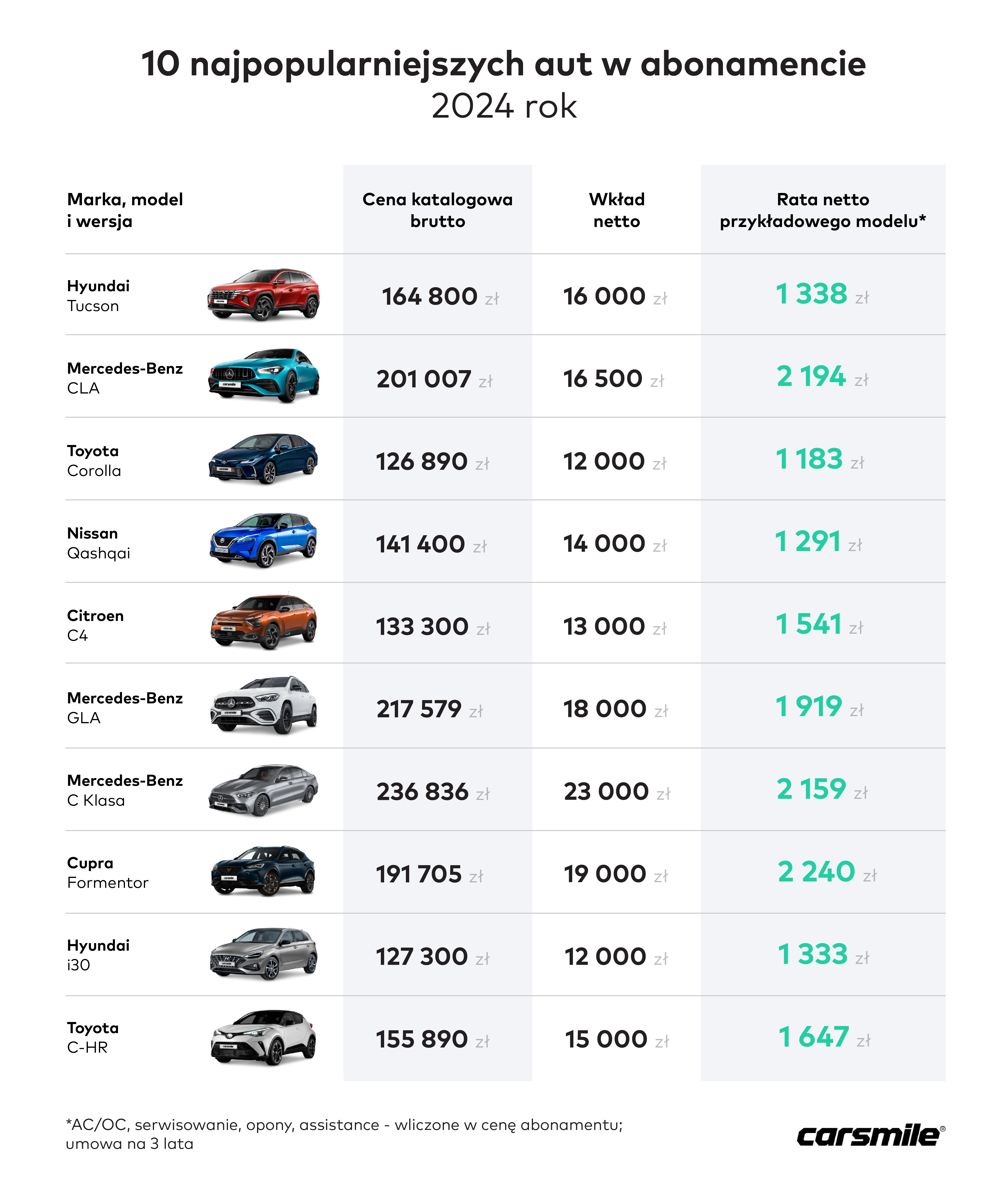 Analitycy Carsmile ujawnili, jakie auta cieszą się obecnie największą popularnością wśród użytkowników poszukujących wynajmu długoterminowego. Pod uwagę wzięli dane z wniosków o wynajem auta, złożonych za pośredniemu platformy Carsmile w styczniu i w lutym 2024 r. Największą popularnością cieszył się w tym okresie Hundai Tucson, na drugim miejscu znalazł się Mercedes CLA, a na trzecim uplasowała się – Toyota Corolla. Średni koszt wynajęcia auta z listy TOP 10 wynosi 1594 zł netto przy wkładzie własnym wynoszącym 15 500 zł netto (umowa na 3 lata; ubezpieczenie AC/OC., serwisowanie, opony, assisatnce wliczone w cenę abonamentu).