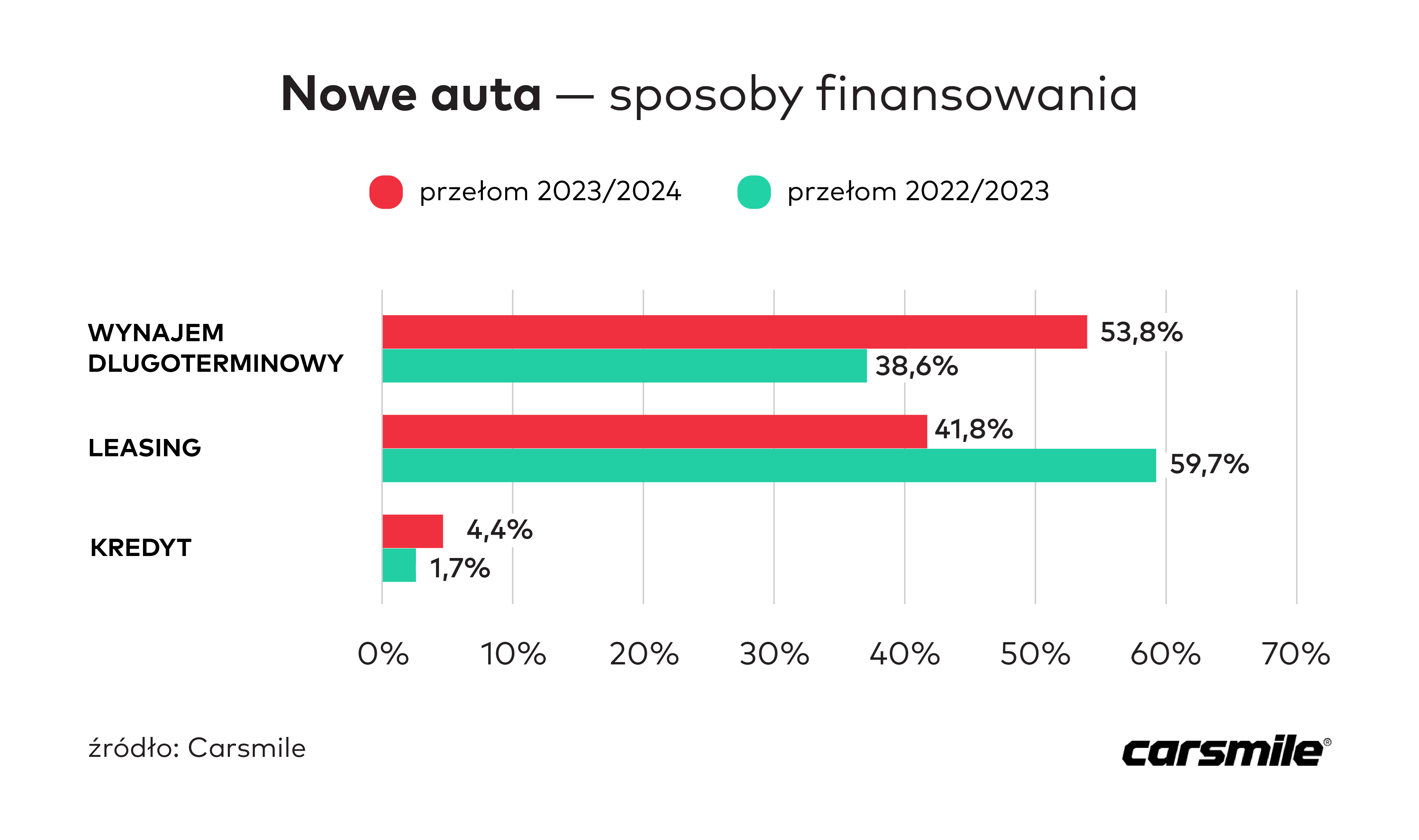 W ostatnich 3 miesiącach aż 54% użytkowników, którzy za pośrednictwem Carsmile zakupili nowe auto, wybrało wynajem długoterminowy. Jest to obecnie najpopularniejsza forma finansowania. Leasing stanowił 42%, a kredyt – 4%. Rok wcześniej proporcje między wynajmem a leasingiem były niemal odwrotne: tylko 39% przypadało na abonamenty, a prawie 60% na leasing. Dane te pokazują jak bardzo sytuacja zmieniła się na przestrzeni kilkunastu miesięcy.