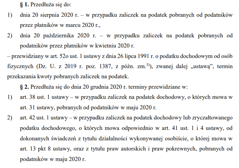 Ministerstwo Finansów 29 maja przekazało projekt rozporządzenia w sprawie przedłużenia terminów przekazania przez niektórych płatników zaliczek na podatek dochodowy i zryczałtowanego podatku dochodowego. Projekt zakłada przedłużenie terminu na wpłatę podatku dochodowego od osób fizycznych pobranego w formie zaliczek na podatek dochodowy i zryczałtowany podatek dochodowy, od wypłat lub świadczeń ze stosunku służbowego, stosunku pracy, pracy nakładczej lub spółdzielczego stosunku pracy oraz od zasiłków pieniężnych z ubezpieczenia społecznego.