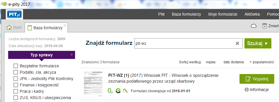 Wniosek PIT-WZ można złożyć tylko za pośrednictwem Internetu przez Portal Podatkowy, system e-Deklaracje lub za pośrednictwem banków. Wniosek ten można również wypełnić w programie do rozliczeń rocznych e-pity 2017. W bazie formularzy znajdziemy formularz PIT-WZ.