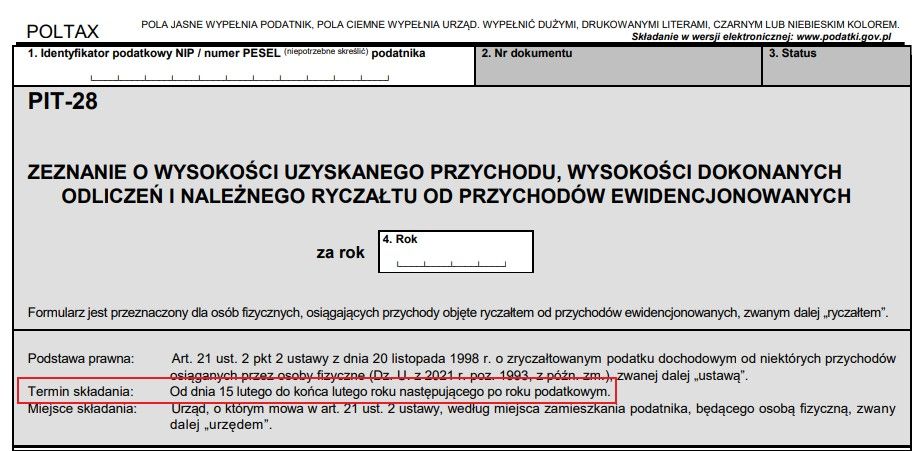 Deklarację PIT-28 można składać internetowo lub tradycyjnie, na formularzu drukowanym. Od 15 lutego 2022 roku podatnicy znajdą także przygotowane wstępnie rozliczone zeznania podatkowe w rządowej usłudze Twój e-PIT.
