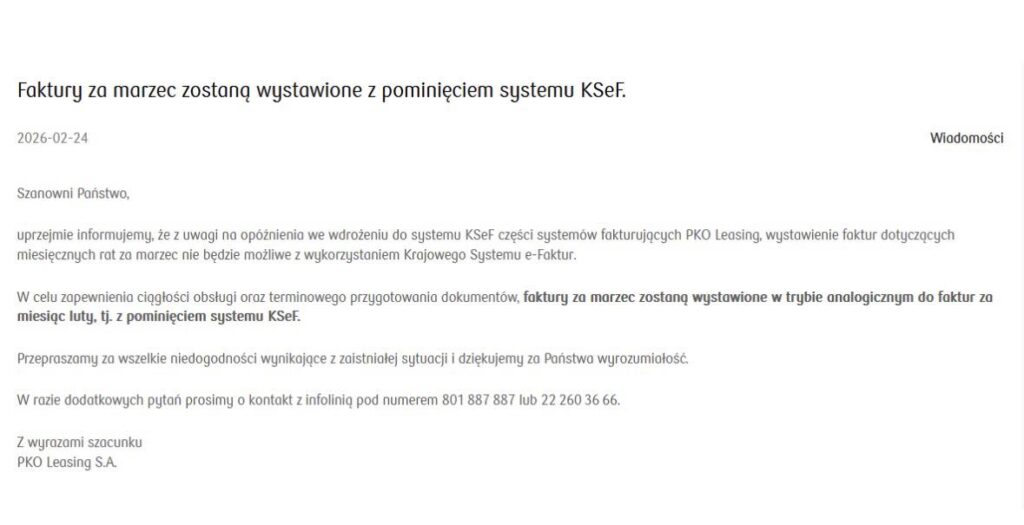 Nasi czytelnicy informują, że otrzymali informacje od PKO Leasing, iż z powodu opóźnienia we wdrażaniu KSeF do systemów fakturujących PKO Leasing – podobnie jak na początku lutego – tak i na początku marca – faktury z miesięcznymi ratami za marzec nie pojawią się w KSeF. Zostaną wystawione z pominięciem systemu KSeF.
