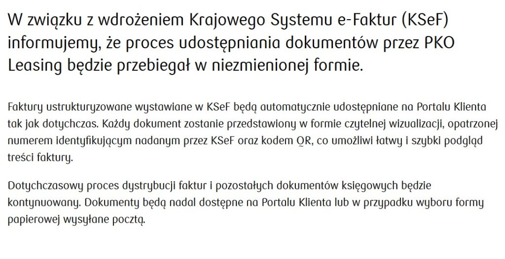 Chodź w styczniu był komunikat na stronach PKO Leasing z informacją o wdrożeniu KSeF