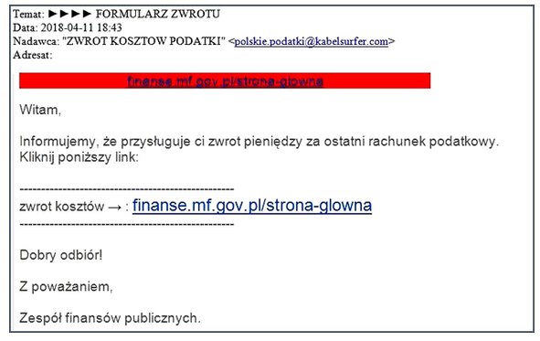 Od kilku dni Ministerstwo Finansów oraz urzędy skarbowe dostają zgłoszenia podatników o otrzymaniu podejrzanych wiadomości e-mail. Treść e-maila dotyczy zwrotu pieniędzy za ostatni rachunek podatkowy a wiec ostatnie zeznanie podatkowe PIT. Warunkiem uzyskania informacji jest uzupełnienie przez podatnika formularza elektronicznego – rzekomo na stronie Ministerstwa Finansów. Należy mieć się jednak na baczności. Wszystkie tego rodzaju wiadomości e-mail są fałszywe i służą wyłącznie wyłudzeniu danych osobowych, hasła do logowania do poczty elektronicznej, a także – danych do karty kredytowej.