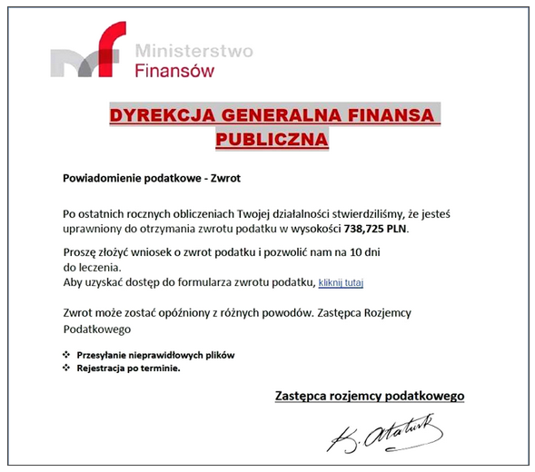 Ministerstwo Finansów ostrzega przez wiadomościami e-mail, masowo wysyłanymi na skrzynki pocztowe podatników, dotyczącymi „zwrotu pieniędzy za ostatni rachunek podatkowy”. Ministerstwo Finansów oraz urzędy skarbowe informują, że nie są autorami napływających wiadomości.