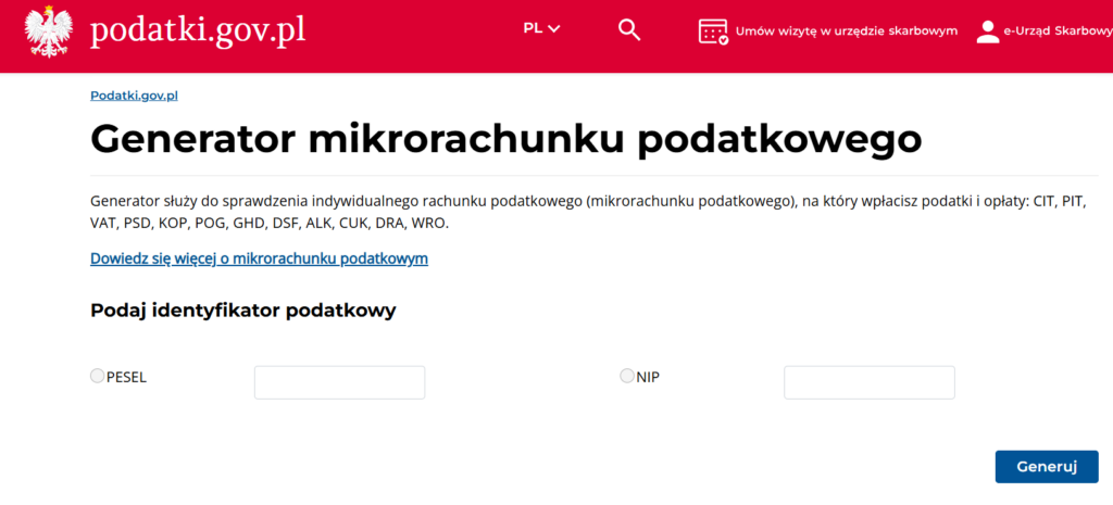 Jak przypomina Minister Finansów ,,od 1 stycznia 2020 r. podatek PIT płacimy do urzędu skarbowego wyłącznie na indywidualny rachunek podatkowy (tzw. mikrorachunek podatkowy). Numer swojego mikrorachunku można sprawdzić w generatorze dostępnym na stronie podatki.gov.pl, a jeżeli nie masz takiej możliwości, to możesz go uzyskać w urzędzie skarbowym. Wystarczy podać swój numer PESEL lub NIP.