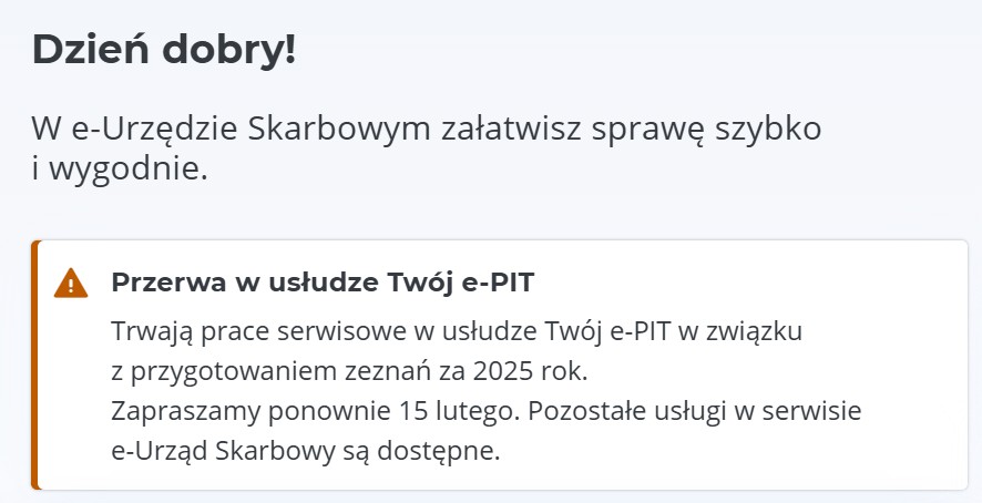 Od 4 do 14 lutego usługa Twój e-PIT jest czasowo niedostępna. KAS musi przeprowadzić zaplanowane prace. Jak co roku Krajowa Administracja Skarbowa wygeneruje elektroniczne rozliczenia dla podatników w usłudze Twój e-PIT. A na to potrzeba czasu.