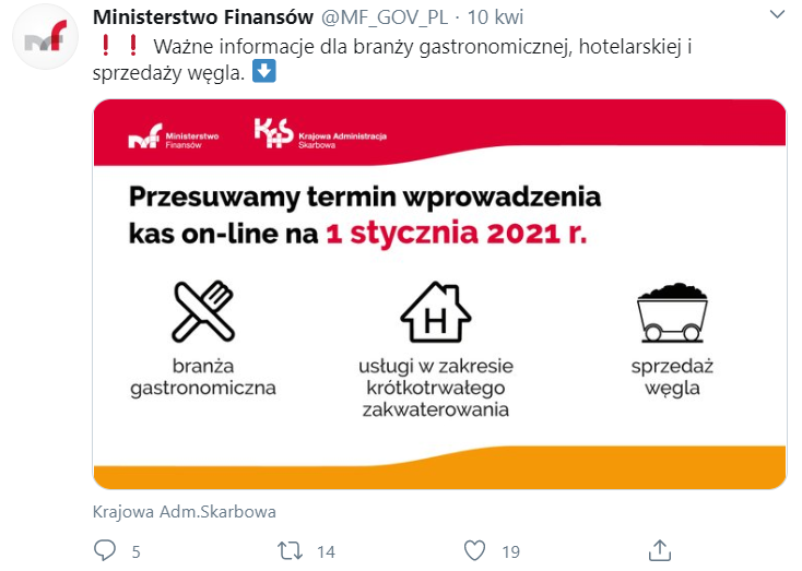 Ministerstwo Finansów zdecydowało o przesunięciu obowiązku instalacji kas online na 1 stycznia 2021 roku. Nowy termin skierowany będzie do branży gastronomicznej, hotelarskiej oraz sprzedaży węgla.