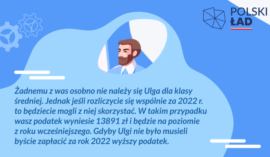 Jednak filmik dotyczący przepisów Polskiego Ładu z konta Ministerstwa Finansów zawiera zapewnienie, że podatnicy skorzystają z ulgi dla klasy średniej, pod warunkiem, że rozliczą się wspólnie, jako małżonkowie.