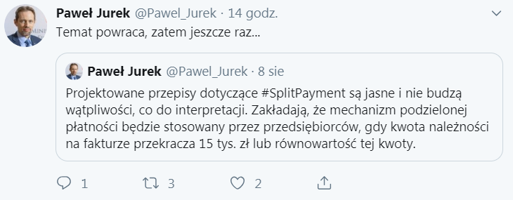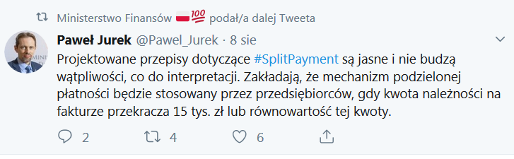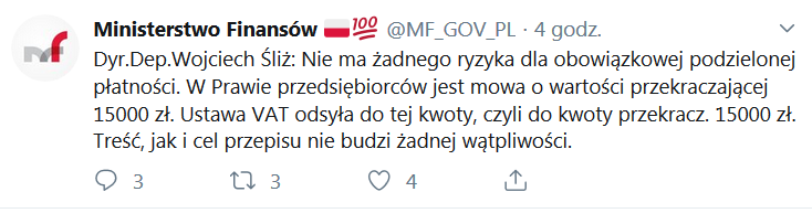 Rzecznik prasowy ministerstwa finansów Paweł Jurek szybko zareagował potwierdzając, że projektowane przepisy o Split payment „są jasne i nie budzą wątpliwości co do interpretacji”. MPP będzie stosowany przez przedsiębiorców, gdy kwota należności na fakturze przekracza 15 tys. zł lub równowartość tej kwoty.