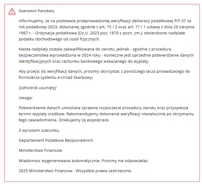 Przestrzegamy przed oszustami, którzy za pomocą fałszywych e-maili próbują wyłudzić dane. Oszuści wysyłają fałszywe wiadomości e-mail, które dotyczą zwrotu podatku i potwierdzenia danych indentyfikacyjnych w celu wypłaty pieniędzy. Wiadomości zachęcają do kliknięcia w niebezpieczne linki lub załączniki. Po kliknięciu w link, użytkownik jest przekierowywany do serwisu, który może wymagać podania poufnych danych. Jest to próba wyłudzenia informacji – informuje MF na swojej stronie internetowej.