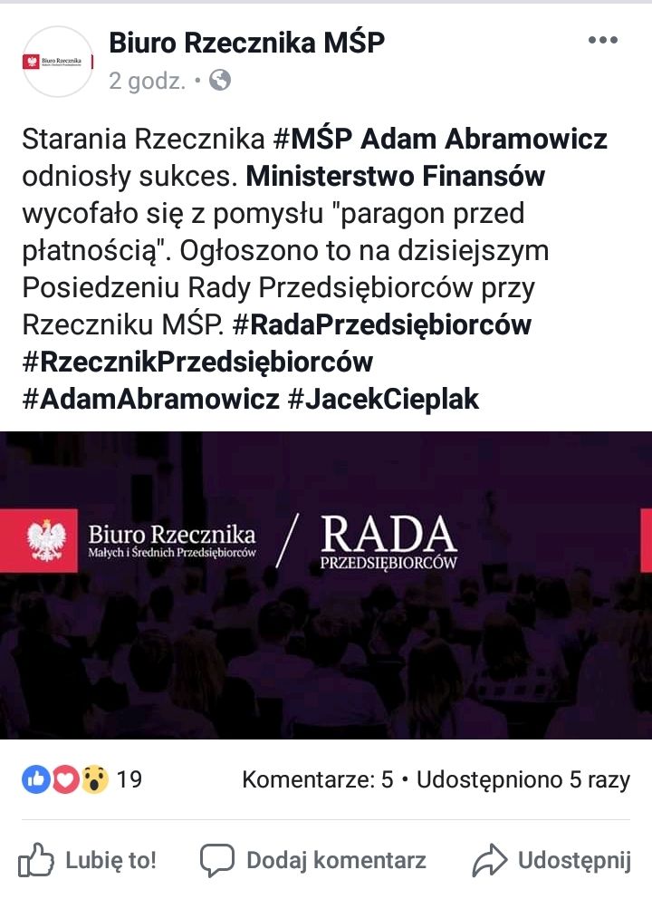 Biuro Rzecznika MŚP poinformowało dziś w mediach społecznościowych, że dzięki staraniom Adama Abramowicza resort finansów zrezygnował z pomysłu na „paragon przed płatnością„. Pisaliśmy o nim już w listopadzie 2018 roku. Proces przekazywania paragonu klientowi miał ulec ogromnej zmianie. Paragon miał być wydawany juz przed przyjęciem gotówki od nabywcy towaru lub usługi.