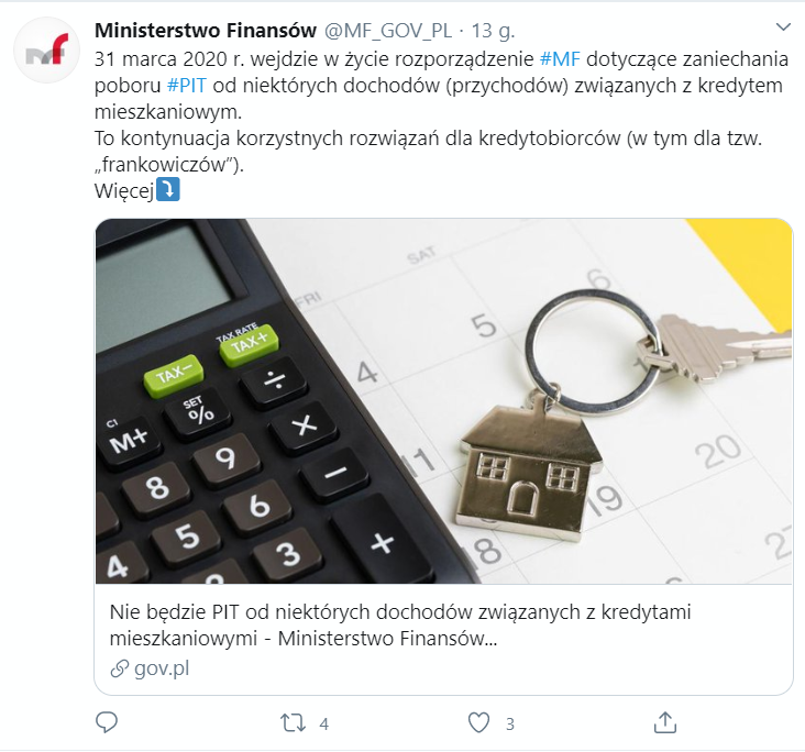 27 marca 2020 r. Minister Finansów podpisał rozporządzenie w sprawie zaniechania poboru podatku dochodowego od niektórych dochodów (przychodów) związanych z kredytem mieszkaniowym udzielonym na cele mieszkaniowe (Dz. U. poz. 548).