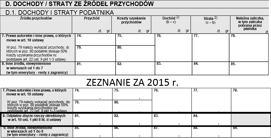 W deklaracji za 2015 r., w części służącej wykazaniu źródeł przychodów, pojawił się dodatkowy wiersz – dla przychodów, kosztów, dochodów i zaliczek z odpłatnego zbycia rzeczy i praw majątkowych, o których mowa w art. 10 ust. 1 pkt 8. W odróżnieniu od pozostałych źródeł wskazujących straty podatkowej, ten wiersz sumuje się osobno nie pozwalając odliczać straty. W efekcie podatnik rzadziej będzie miał możliwość popełnić błąd w rozliczeniu podatkowym.