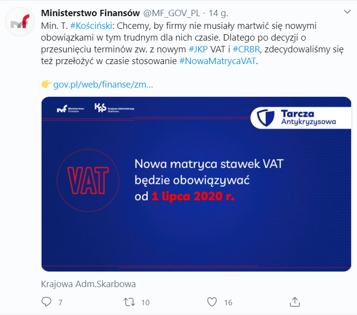 „Chcemy, by firmy nie musiały martwić się nowymi obowiązkami w tym trudnym dla nich czasie. Dlatego po decyzji o przesunięciu terminów związanych z nowym JKP VAT i Centralnym Rejestrem Beneficjentów Rzeczywistych, zdecydowaliśmy się też przełożyć w czasie stosowanie nowej matrycy VAT” – mówi minister finansów Tadeusz Kościński.