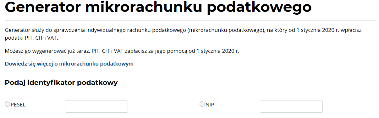 Ministerstwo Finansów udostępniło podatnikom generator mikrorachunków podatkowych. Generator ten dostępny jest na stronie https://www.podatki.gov.pl/generator-mikrorachunku-podatkowego. Można go również uzyskać w każdym urzędzie skarbowym.