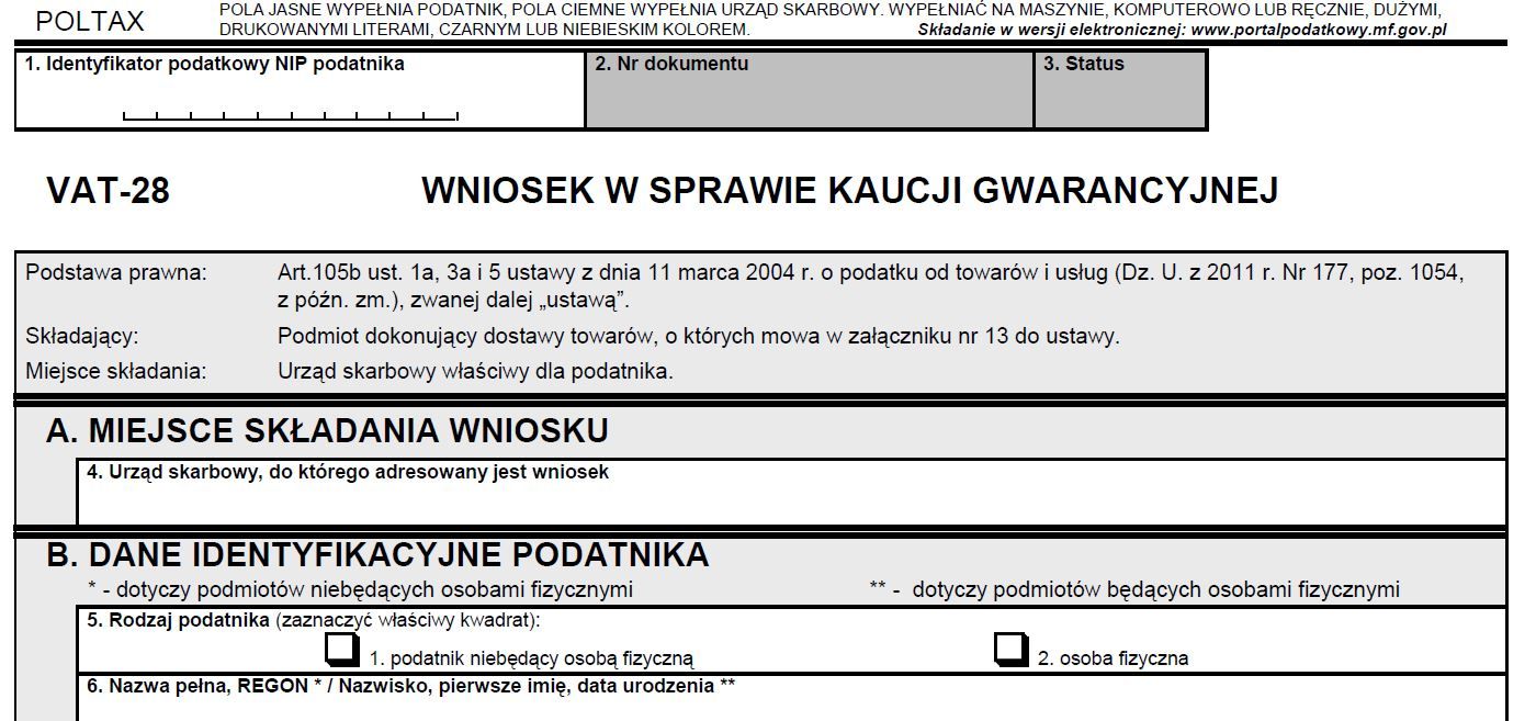 1 lipca zacznie obowiązywać wzór nowej deklaracji VAT-28, czyli wniosek w sprawie kaucji gwarancyjnej wraz z załącznikami VAT-28/A, VAT-28/B, VAT-28/C i VAT-28/D