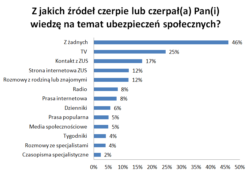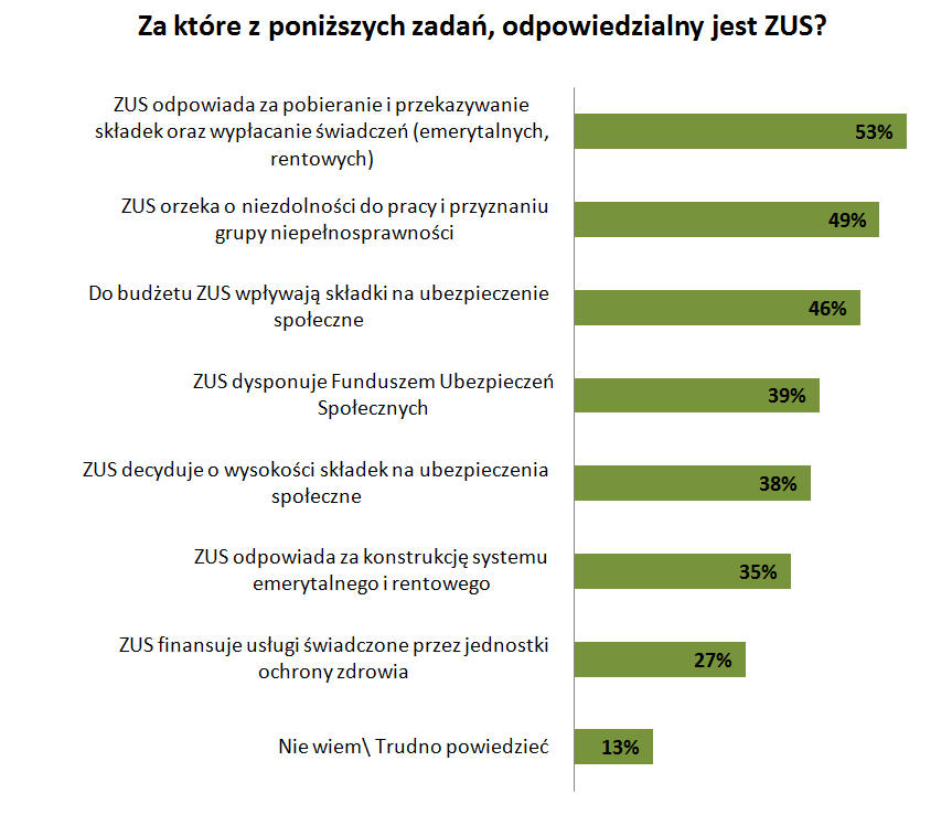 Przeprowadzone w lipcu i sierpniu badanie pokazuje, że aż 3/5 ankietowanych nie ma żadnej wiedzy o systemie ubezpieczeń społecznych lub ich wiedza jest szczątkowa. Badani mylili poszczególne rodzaje ubezpieczenia. Niejednokrotnie nie odróżniali ubezpieczenia chorobowego od zdrowotnego, przypisując Zakładowi Ubezpieczeń Społecznych odpowiedzialność za ochronę zdrowia. Mylone ze sobą są ubezpieczenia rentowe i wypadkowe. Z badania wyłania się obraz społeczeństwa, które nie zna zasad i przepisów związanych z odprowadzaniem składek od różnego rodzaju umów. Dwie piąte badanych nie potrafiło wskazać na poprawną odpowiedź w pytaniu o obowiązki składkowe wynikające z różnych form zatrudnienia i prowadzenia własnej działalności gospodarczej.