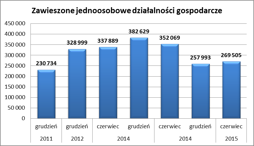 Jak wynika z GUS-owskiej informacji, liczba zawieszonych działalności wynosiła na koniec czerwca 269 505. W stosunku do grudnia 2014 r. mamy do czynienie ze wzrostem liczby zawieszonych firm o ponad 11 tys., ale w stosunku do czerwca 2014 r. widać bardzo wyraźny spadek.