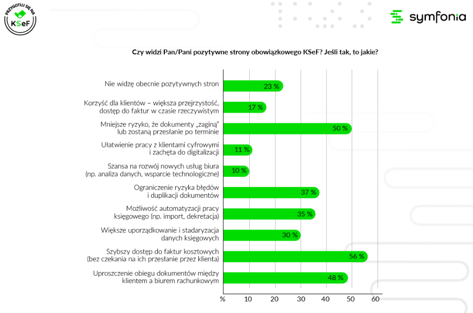 Mniej popularne, choć wciąż istotne, są wskazania związane z uporządkowaniem danych księgowych (30 proc.) oraz rozwojem usług doradczych i cyfrowych. Blisko 23 proc. ankietowanych nie widzi jednak żadnych pozytywnych stron wdrożenia KSeF.