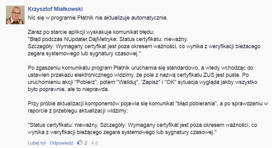 Nasi czytelnicy alarmowali w komentarzach pod pierwszą informacją sprzed kilku dni, uprzedzającą o konieczności obowiązkowej aktualizacji certyfikatu ZUS w programie Płatnik, że aplikacja nie aktualizuje się automatycznie – jak zapewniał Zakład Ubezpieczeń Społecznych – i pojawiają się komunikaty o błędach.