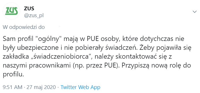 ZUS za pośrednictwem Tweetera podpowiada jak rozwiązać ten problem. Jak twierdzi ,, Sam profil „ogólny” mają w PUE osoby, które dotychczas nie były ubezpieczone i nie pobierały świadczeń. Żeby pojawiła się zakładka „świadczeniobiorca”, należy skontaktować się z naszymi pracownikami (np. przez PUE). Przypiszą nową rolę do profilu”.