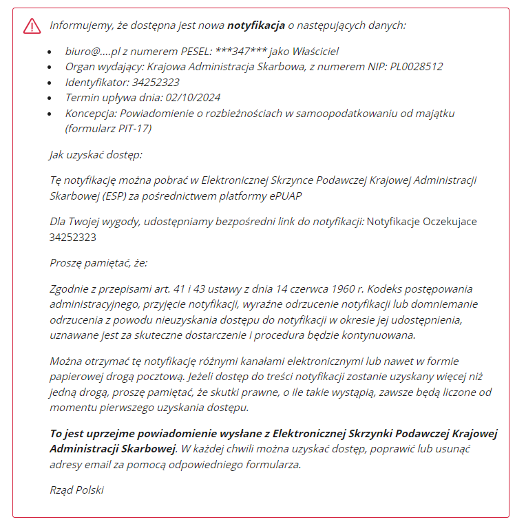 Krajowa Administracja Skarbowa i Ministerstwo Finansów ostrzegają przed próbą wyłudzenia danych za pomocą wiadomości e-maili. W wiadomościach podawana jest informacja, że na odbiorcę czeka notyfikacja, którą można odczytać klikając w link.