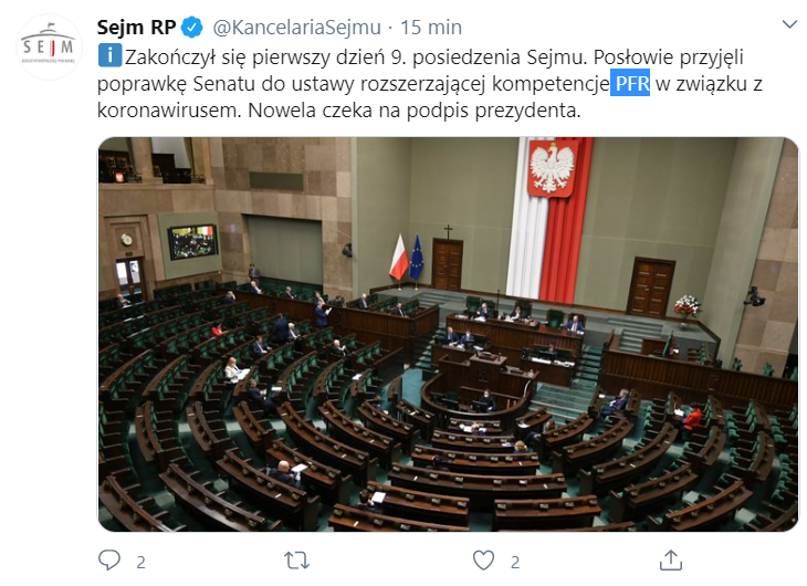 We wtorek 31 marca popołudniu Sejm przyjął ustawę antykryzysową, odrzucając większość poprawek Senatu. Posłowie przyjęli tylko poprawkę dotyczącą rozszerzenie kompetencji PFR w związku z koronawirusem.