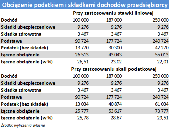 Tyle że plany rządu są szersze. W wywiadzie dla „Pulsu Biznesu” minister Henryk Kowalczyk wspominał o takich zmianach w rozliczeniach dotyczących m.in. przedsiębiorców, że łączne opodatkowanie ich dochodów mogłoby sięgnąć nawet 40%. Proste przeliczenie pokazuje, że w przypadku przedsiębiorców o dochodach 187 tys. rocznie (taki był średni dochód „liniowców” w 2914 r.) oznaczałoby to wzrost w stosunku do obecnej sytuacji o 65%, zaś w przypadku uzyskujących dochód na poziomie 250 tys. zł rocznie – aż o 75%.