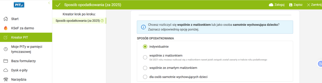 Po klinięciu w przycisk uruchom podatnik zostanie przekierowany do strony na której wskazać musi czy jego zeznanie PIT będzie zeznaniem indywidualnym, czy może wspólnym z małżonkiem.