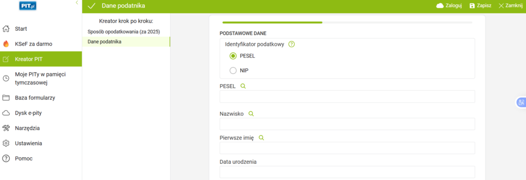 Po kliknięciu w przycisk dalej podatnik zostanie poproszony o uzupełnienie danych osobowych (Imię, Nazwisko, Pesel, Adres Zamieszkania, Urząd Skarbowy właściwy podatnikowi itd.).