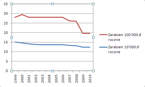 Przeanalizujmy przykład pierwszy. Jeden z podatników zarabia w okresie 1999-2010 10’000 zł rocznie. Drugi 100’000 zł rocznie. Na ich przykładzie wyraźnie widać skutki opisanych wyżej pozytywnych zmian w podatku dochodowym od osób fizycznych. Pierwszy z nich zapłaci za rok 2010 261 zł mniej, niż za rok 1999. Drugi z nich zapłaci aż o 8’658 zł mniej, niż 12 lat wcześniej. Spada bowiem realna stopa procentowa PIT. Podatnik zasobniejszy zapłaci obecnie 19,5 % PIT zamiast 28,1 % dwanaście lat wcześniej. Podatnik uboższy zapłaci 12,4 % zamiast 15,1 % w 1999 r.