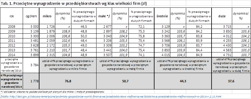Przeciętne wynagrodzenia w mikroprzedsiębiorstwach, czyli firmach zatrudniających do 9 pracowników są dużo niższe niż w firmach małych, średnich i dużych. Analiza lat 2008-2014 wskazuje, że nigdy w tym okresie nie przekroczyły one 50 proc. przeciętnego wynagrodzenia w firmach dużych i 2/3 przeciętnego wynagrodzenia w firmach małych. Płace w firmach małych (zatrudnienie 10-49 pracowników) były w całym analizowanym okresie wyższe o ponad 50 proc. od przeciętnego wynagrodzenia w firmach mikro.