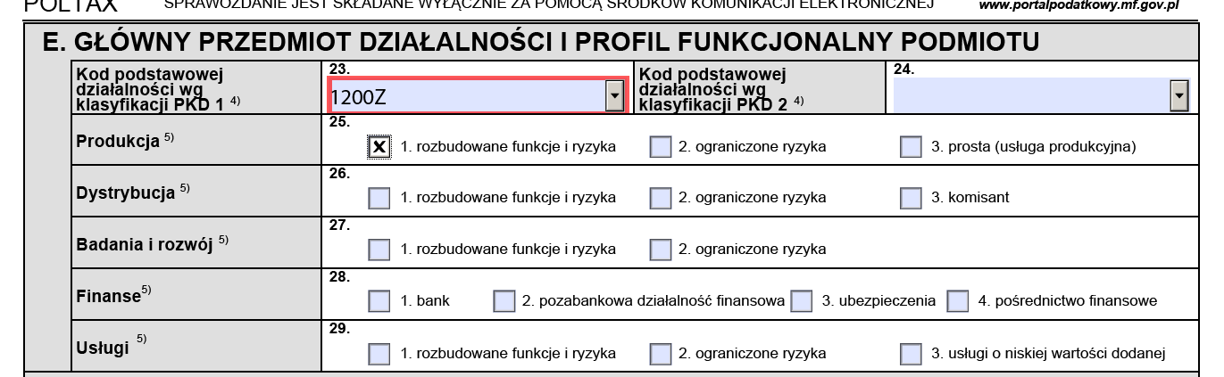 W sekcji E, formularz umożliwia wpisanie jednego lub dwóch kodów PKD. Należy wskazać kod działalności, który w największym stopniu odnosi się do główne­go przedmiotu działalności. W sytuacji, w której podatnik ma niejednorodny profil działalności i prowadzi istotną działalność w obszarach opisanych więcej niż jednym kodem, wskazu­je dwa najważniejsze kody PKD.