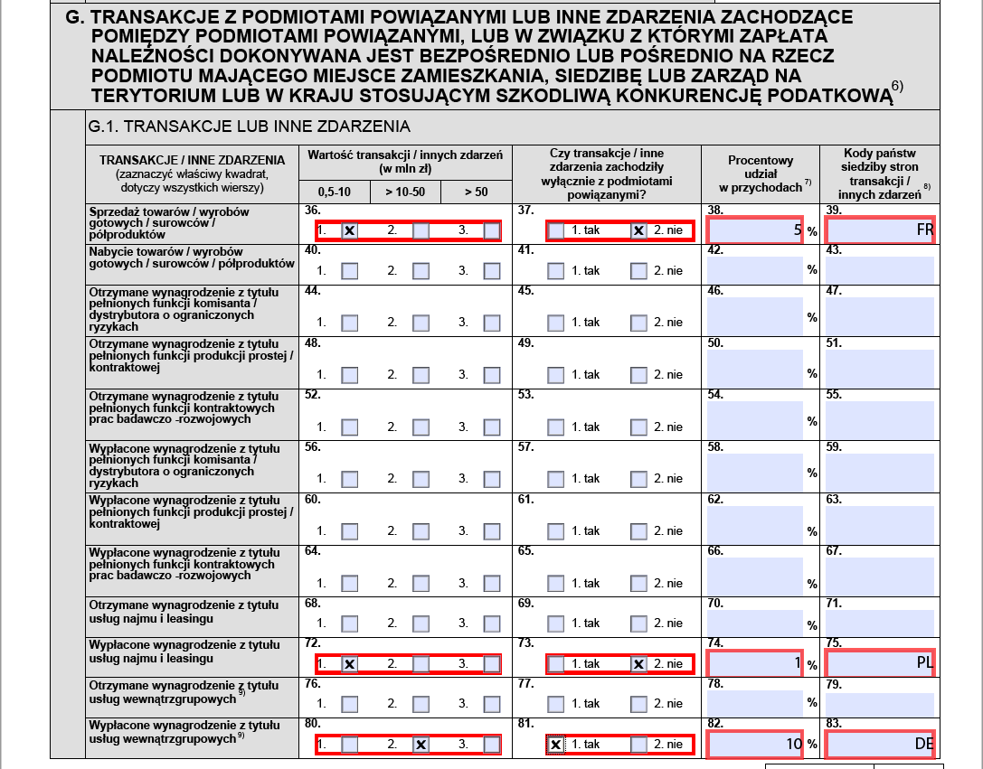W sekcji G podatnik wskazuje rodzaj oraz wartość transakcji zrealizowanych z podmiotami powiązanymi. Poniższa instrukcja w zakresie prawidłowego określenia wartości transakcji odnosi się do wszystkich pozycji zawartych w sekcji G.