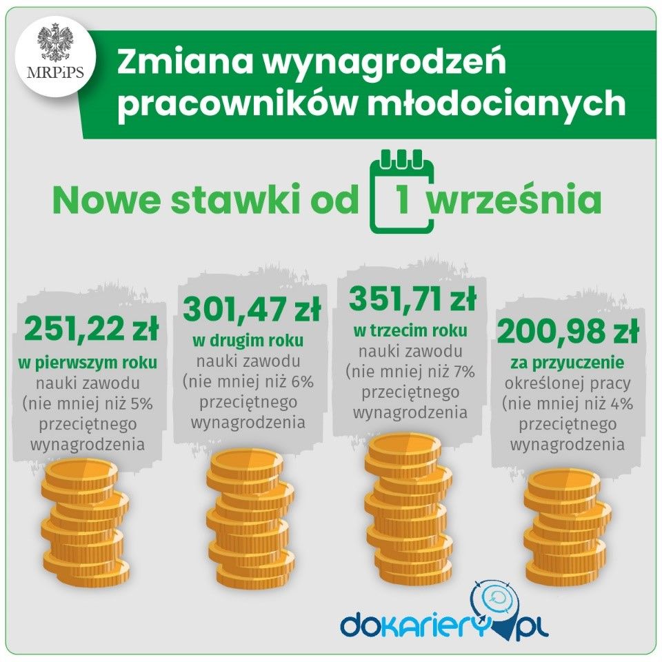 Młodocianemu w okresie nauki zawodu oraz przyuczenia do wykonywania określonej pracy przysługuje wynagrodzenie obliczane w stosunku procentowym do przeciętnego miesięcznego wynagrodzenia w gospodarce narodowej w poprzednim kwartale, obowiązującego od pierwszego dnia następnego miesiąca po ogłoszeniu przez Prezesa GUS.