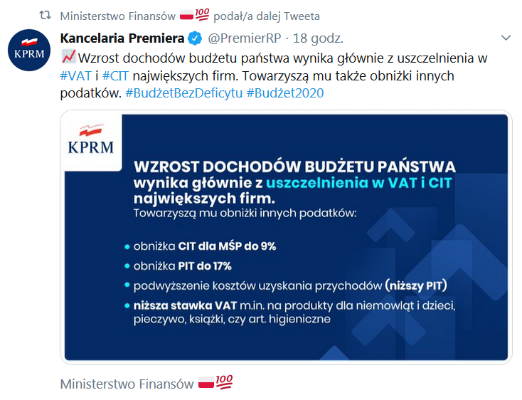 Rada Ministrów przyjęła wstępnie projekt ustawy budżetowej na rok 2020, w którym po raz pierwszy od 1990 roku nie zaplanowano deficytu. Wzrost dochodów budżetu państwa wynika głównie z uszczelnienia w VAT i CIT największych firm – przekonuje Premier.