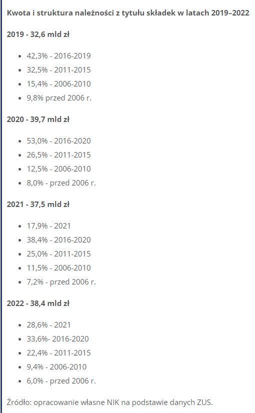 W latach 2019-2022 przychody z tytułu składek (składki na ubezpieczenie społeczne, ubezpieczenie zdrowotne, Fundusz Pracy, Fundusz Gwarantowanych Świadczeń Pracowniczych i Fundusz Emerytur Pomostowych) wzrosły z 283,2 mld zł w 2019 r. do 377,5 mld zł w 2022 r., tj. o 33%. Należności z tytułu tych składek wzrosły w tym okresie z 32,6 mld zł do 38,4 mld zł, tj. o 5,8 mld zł. Liczba kont płatników z zadłużeniem zmniejszyła się z 1,4 mln na koniec 2019 r. do 1,3 mln na koniec 2022 r.