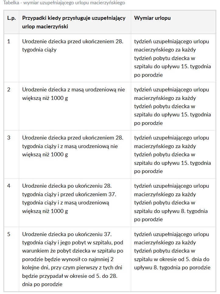 W przypadku urodzenia więcej niż jednego dziecka podczas jednego porodu, przy ustalaniu wymiaru uzupełniającego urlopu macierzyńskiego uwzględniane będą: waga dziecka o najniższej masie urodzeniowej oraz czas hospitalizacji dziecka, które spędziło najdłużej w szpitalu.