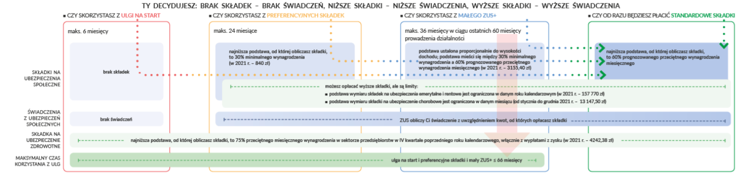 Jak podkreśla Zakład Ubezpieczeń Społecznych – przygotowany wachlarz ulg i preferencji zostawia przedsiębiorcy wybór w zakresie formy wsparcia, z jakiej chce skorzystać. Wśród najpopularniejszych form dedykowanych przedsiębiorcom zakładającym działalność gospodarczą oraz form wsparcia skierowanych dla młodych firm, jest: