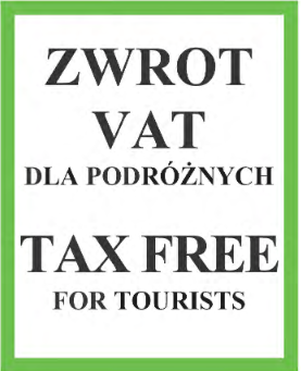 *Szczegółowy wzór znaku określa obwieszczenie Ministra Finansów z dnia 22 lutego 2018 r. w sprawie ogłoszenia jednolitego tekstu rozporządzenia Ministra Finansów w sprawie określenia wzorów: znaku informującego podróżnych o możliwości zakupu w punktach sprzedaży towarów, od których przysługuje zwrot podatku od towarów i usług, oraz stempla potwierdzającego wywóz towarów poza terytorium Unii Europejskiej, a także określenia niezbędnych danych, które powinien zawierać dokument będący podstawą do dokonania zwrotu podatku podróżnym.